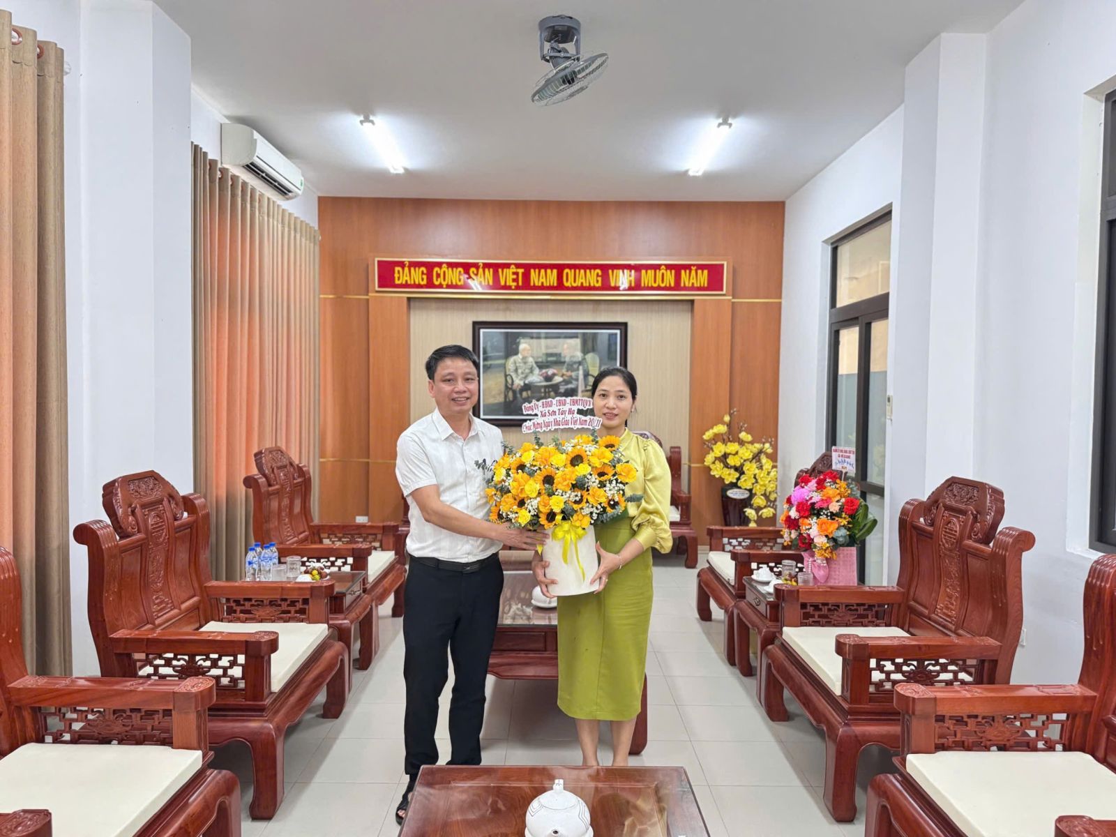 Đồng chí Nguyễn Văn Trí – Phó Chủ tịch UBND xã Sơn Tây Hạ tặng hoa, chúc mừng Sở Giáo dục và Đào tạo tỉnh Quảng Ngãi